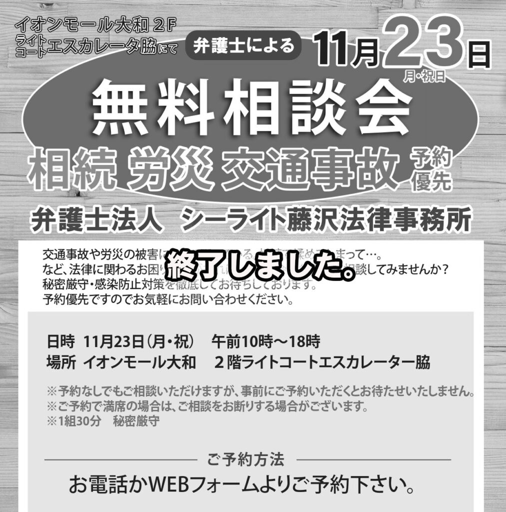 【終了】11月23日(月祝)無料 定期相談会(相続問題・労働災害・交通事故) (イオンモール大和)