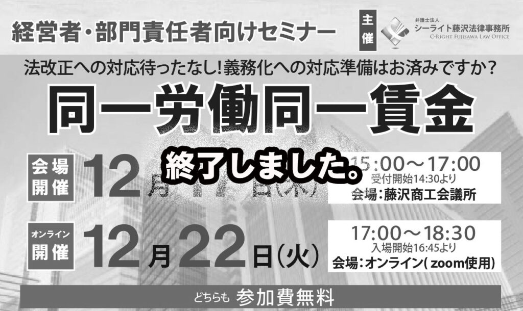 【終了】12月17日(木)、12月22日(火)同一労働同一賃金セミナー(藤沢商工会議所・オンライン)